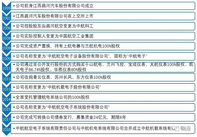 中航电子前身为江西昌河汽车股份有限公司成立于1999 年,主营业务为微型汽车客车和货车的生产和销售;2001 年在上交所上市;2009 年公司为改善财务状况、增强持续盈利能力,置出盈利能力较弱的汽车资产与业务,置入实际控制人航空工业持有的上航电器及兰航机电100%资产,公司主营业务变更为航空机载照明与控制系统产品的制造业务;2011 年公司通过向航空工业、中航科工、航电系统公司和汉航集团非公开发行股份的方式购买千山航电、兰州飞控、宝成仪表和太航仪表100%股权、凯天电子86.74%股权、华燕仪表80%股权,公司的主营业务扩展到整个航空机载电子设备领域;2013 年公司收购中航航空电子系统有限责任公司持有的青云仪表100%股权、东方仪表100%股权,收购汉航集团持有的苏州长风100%股权,公司子公司增加到11 家,拓展航空电子产品线、扩大经营规模、实现协同效应,进一步提升盈利水平和行业地位;2014 年航空工业将其持有的航电系统公司100%股权委托公司管理;2017年完成24亿可转换公司债发行。