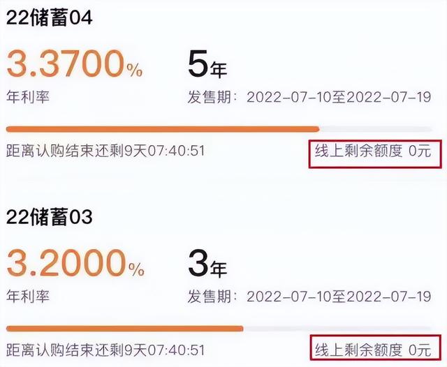 又比如7月发行的两期储蓄国债(电子式),3年期票面年利率为3.2%、5年3.37%,利率不算特别高,但400亿额度出来没多久就被疯抢一空,很多人上线前就守着都没抢到。