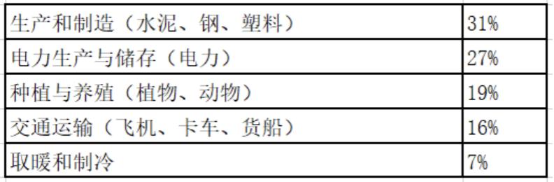 对气候变化研究多年后,比尔·盖茨将造成温室气体排放的人类活动进行了分类,并计算出了排放量的占比。结果如下: