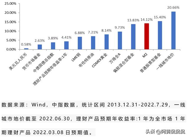 要想跑赢M2真心不容易,从过往资产收益表现来看,如图,过去8年绝大部分的资产比如大宗商品、债券、银行理财等长期收益率都大幅跑输M2增速。能跑赢M2增长的资产只有普通股票型基金指数、少数一线城市地价房价增速这两类资产。