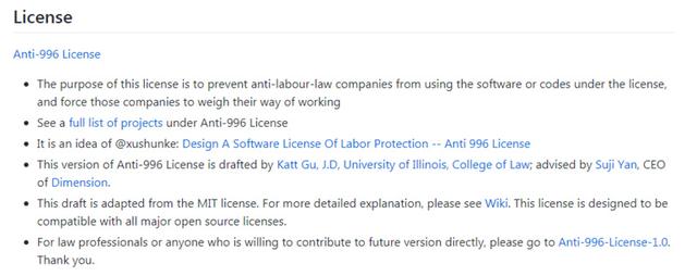 不同于一般的劳动者抗议,程序员希望用自己的方式来解决困境。除了列举996黑名单公司,把劳动法再摘抄一遍,996.ICU 正在起草一份具有Github社区效力的开源软件许可协议“Anti 996 License”,加入到这份协议中的开源代码,将不被许可于那些实行996工作制度的黑名单公司使用。互联网公司使用开源代码的范围非常广大。