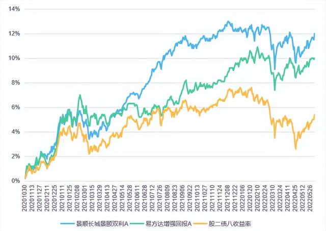 两只偏债基金均大幅跑赢了股二债八收益率,景顺长城景颐双利债券A在2021年下半年的收益表现,明显比易方达增强回报A更好,不过后面也被逐渐追上了。