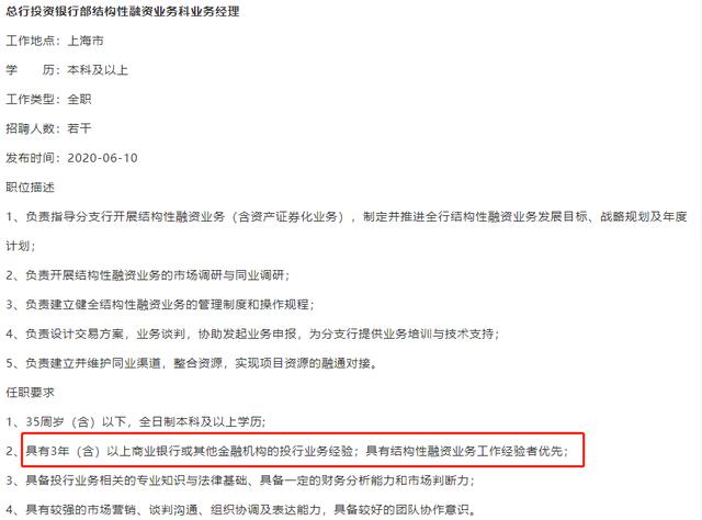 这一种情况在校招中发生的比较少,更多的是发生在社招中,大家去查看一下各大银行投资银行部的社招信息就可以看出来,如果想要通过社招进入投资银行部,首先我们的学历背景不能太差,其次,还要有相关的工作经验。另外,不同于校招,社招往往会对岗位进行最大程度的精细划分,会对大家的过往经历进行严格的审核。