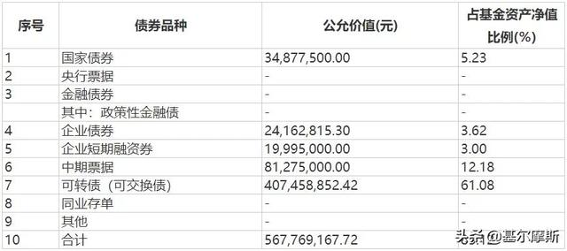 通过三季报数据统计,截至三季度末,这只基金共持有30只可转债(可交换债),合计公允价值达4.07亿元,占基金资产净值比例高达61.08%。