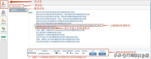 点击页面左侧【我要提取-提取公积金提取申请】,在新事项申请列表中点击【使用商业银行货款及使用异地住房公积金贷款购买北京市行政区域外住房申请提取住房公积金】