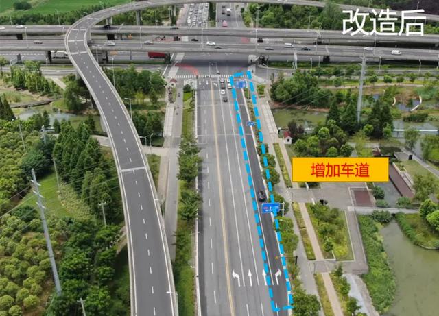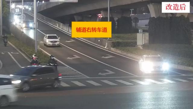 北进口辅道直行车道改为右转车道,减少路口运行相位,提升路口通行效率。