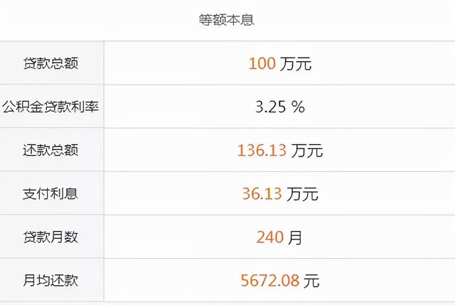 我们按照等额本息贷款100万,分20年还清,用公积金贷款支付利息为36.13万元,月均还款5672.08元。(见下图)