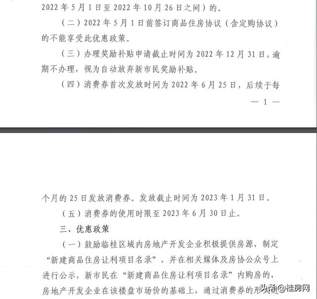 (一)鼓励临桂区域内房地产开发企业积极提供房源,制定“新建商品住房让利项目名录”,并在相关媒体及房协公众号上进行公示,新市民在“新建商品住房让利项目名录”内购房的,房地产开发企业在该楼盘市场价的基础上,通过消费券的形式进行优惠回馈,每套优惠回馈3万元消费券。新市民购房优惠回馈按照先购后付的原则发放。