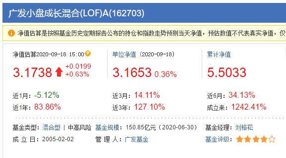 3、基金经理:刘格菘,累计任职时间:6年又159天,刘格菘先生:经济学博士,持有中国证券投资基金业从业证书。曾任中邮创业基金管理有限公司研究员、基金经理,融通基金管理有限公司权益投资部总经理、基金经理,广发基金管理有限公司权益投资一部研究员、权益投资一部副总经理、北京权益投资部总经理、广发行业领先混合型证券投资基金基金经理(自2017年6月19日至2019年5月31日)。现任广发基金管理有限公司成长投资部总经理、广发小盘成长混合型证券投资基金(LOF)基金经理(自2017年6月19日起任职)、广发创新升级灵活配置混合型证券投资基金基金经理(自2017年7月5日起任职)、广发鑫享灵活配置混合型证券投资基金基金经理(自2017年11月9日起任职)、广发双擎升级混合型证券投资基金基金经理(自2018年11月2日起任职)、广发多元新兴股票型证券投资基金基金经理(自2018年11月5日起任职)、广发集嘉债券型证券投资基金基金经理(自2018年12月25日至2020年7月23日任职)、广发科技创新混合型证券投资基金基金经理(自2019年12月25日起任职)。2020年1月22日担任广发科技先锋混合型证券投资基金基金经理。