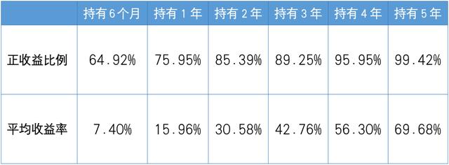 根据wind数据统计,持有半年的平均收益率仅仅为7.40%;如果持有3年、5年,平均收益率增长至42.76%、69.68%。