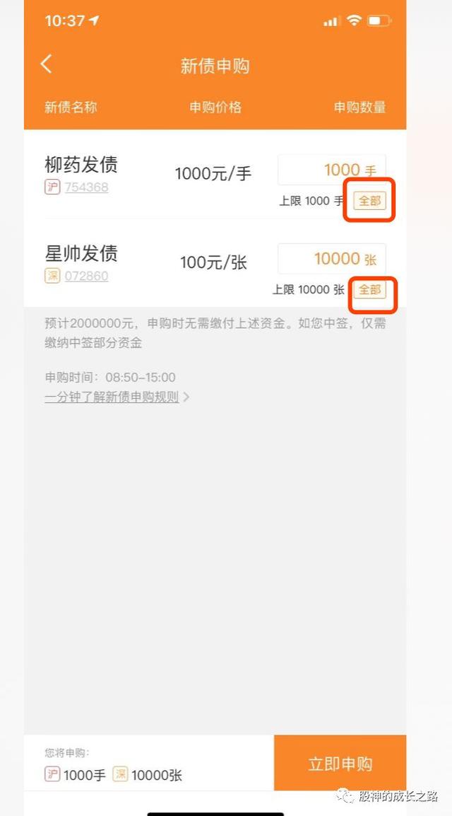 打新债的时候一定要购买全部,打新债也是要看运气的,不是打了就能中,一般中签只能中1手(1000元),也就是10张。所以不会出现中签后交不起钱的情况。中签后一般1个月内公司就会上市,上市当天卖出即可。收益在150-200元之间。