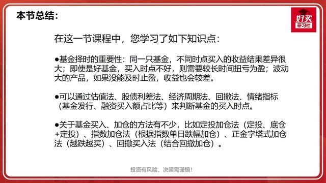 注意,无论哪种方法,前提都是要选择好的基金。另外,市场是千变万化的,基于历史预测未来可能会失效。同时,任何一个指标都不可能绝对正确,只是站在概率的角度看问题,因此对市场行情的判断也不应仅靠一个指标,还要结合估值、流动性、盈利、市场情绪等多方面指标综合衡量。