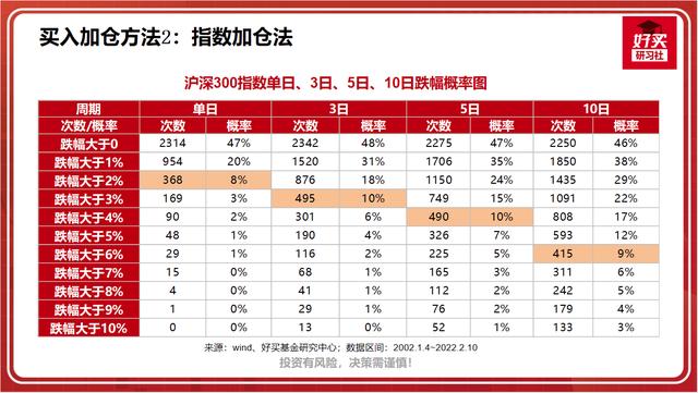 为了找到最佳的参数,以沪深300为例,我们统计了指数近20年的单日、3日、5日、10日四个常用周期内的,跌幅超过一定比例的次数和概率,如下图: