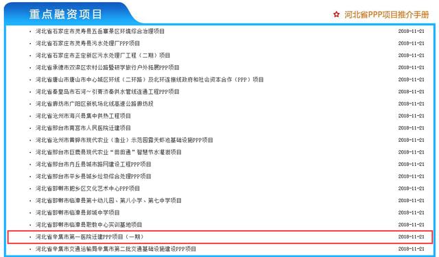此前,河北省财政厅网站曾于2018年11月21日发布《2018第四届中国PPP融资坛(上海)河北省PPP项目推介》,其中就包括河北省辛集市第一医院迁建PPP项目(一期)。