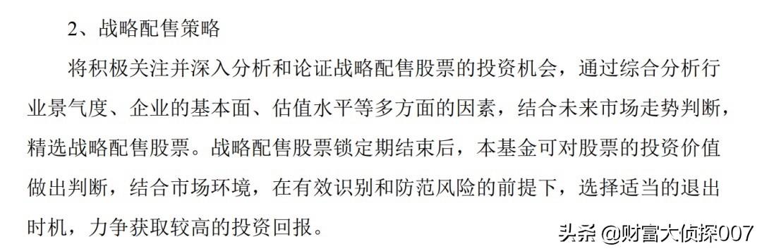 另外,心思缜密的基民应该也能从这些基金的招募说明书发现一定问题。这里以汇添富3年战略配售(501188)的招募说明书为例,在其中关于投资策略的说明中提到,基金主要用“本基金主要投资通过战略配售取得的股票,在封闭运作期内主要采用战略配售策略和债券投资策略”。