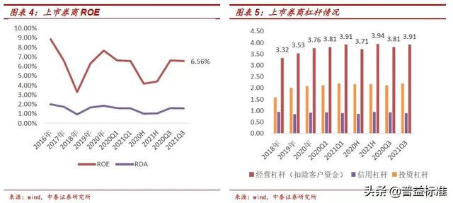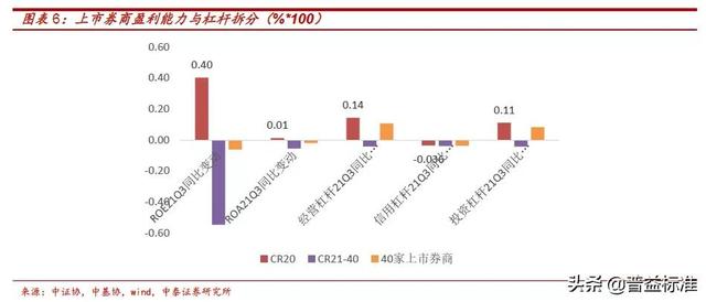财务数据:CR20券商业绩增长略优于行业,杠杆相对稳定。1)净资本排名前20券商营收、净利润同环比略优于行业。40家上市券商2021前三季度实现营收4679亿元,同比 23%,其中净资本排名前20券商(按照21H排序,下文简称CR20券商)实现营收3981亿元,同比 25%,优于上市券商总体2个百分点,净利润增幅与营收相同。单季度来看,40家上市券商21Q3实现营业收入1626亿元,同比 14%,环比-3.5%,净利润515亿元,同比 12%,环比-10%,其中CR20 营收同比 15%,环比-2%,净利润同比 13%,环比-9%,均略优于行业,集中度角度CR20占上市券商营收比例85%,对应净利润比例86%,相比Q2均小幅提升1个百分点。2)CR20 ROE 提升至7%以上,部分中小券商有所下滑,行业杠杆稳定接近4。2021前三季度CR20券商ROE(加权)平均值7.84%,同比提升0.4个百分点,上市券商平均值6.56%,同比下降0.06个百分点,部分中小券商ROE有所下滑,CR20券商V.S全部上市券商ROA、经营杠杆差额分别为0.03%、0.24;杠杆变动情况来看,上市券商经营杠杆水平3.91,同比提升0.11,相比中报小幅收缩,CR20经营杠杆4.15,与中报基本持平,同比提升0.14。