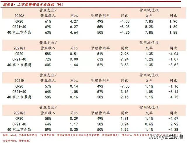 上市券商营业成本率相对稳定,信用减值损失率相比2020年显著改善。2021前三季度上市券商营业支出同比 23%,其中CR20同比 25%,营业成本率相比2020年全年小幅改善4个百分点,中小券商仍在60%以上。信用减值损失率延续Q1收缩趋势,维持在1.1%,同比下降4.4个百分点,我们预计,随着存量业务的不断压降,行业信用业务风险可控,对收入边际影响下滑。