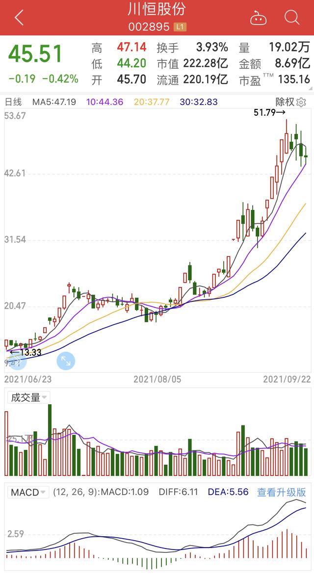 川恒转债对应的正股为川恒股份(002895),川恒股份是贵州省黔南布依族苗族自治州的一家上市公司,公司是一家专业从事磷酸及磷酸盐产品的研发、生产和销售的企业。公司主营业务主要是磷酸二氢钙、磷酸一铵与少量掺混肥,水溶肥及聚磷酸铵的生产、销售。公司自2017年8月上市以来,经营状况良好,基本面稳定,业绩良好。2021年半年度报告每股收益为0.216元,截止到9月22日周三收盘,股票价格为45.51元,动态市盈率为135.16倍(最近涨幅太大导致市盈率飙升)。