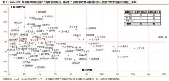 具体来看,正股在赎回的登记日之前超额收益的情况与相关转债转股的稀释比例关系较强。如下图所示,当稀释比例大于5%时,有22只转债正股超额收益为负,9只转债为正;当稀释比例小于5%时,有27只转债正股超额收益为负,仍然略大于超额收益为正的数目(20只)。因此,从2014年以来数据来看,在公告强赎后,转债转股对于正股表现的影响并不能忽视。市场对于有强赎风险的标的仍然需要更加深入的基本面分析。