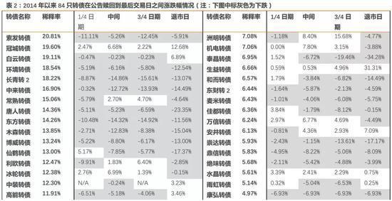我们对2014年以来84只公告赎回的转债进行统计。在发行人首次公告赎回到最后交易日之间,84只转债的上涨概率只有35.71%,其中从首次公告赎回到四分之一时间节点(比如8月1日公告赎回,8月20日为最后交易日,则四分之一时间节点大致为8月5日)、到中间日期、到四分之三时间节点上涨概率分别为42%、42%、41%,概率较为稳定,上涨概率会在“最后一刻”降低。